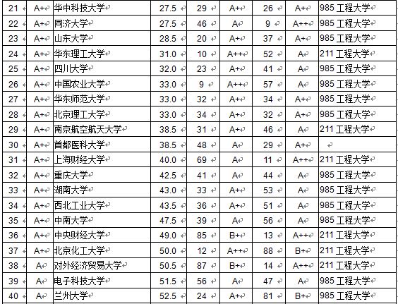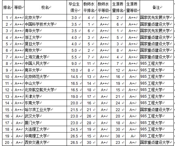在本排行榜中,本科畢業(yè)生質(zhì)量C級及以上的,列出排名和等級,C級以下的只列等級,不列排名。教師平均學(xué)術(shù)水平在B級及以上的,列出排名和等級,B級以下的只列等級,不列排名;新生錄取分?jǐn)?shù)線(生源質(zhì)量)在B級及以上的,列出排名和等級,B級以下的只列等級,不列排名。